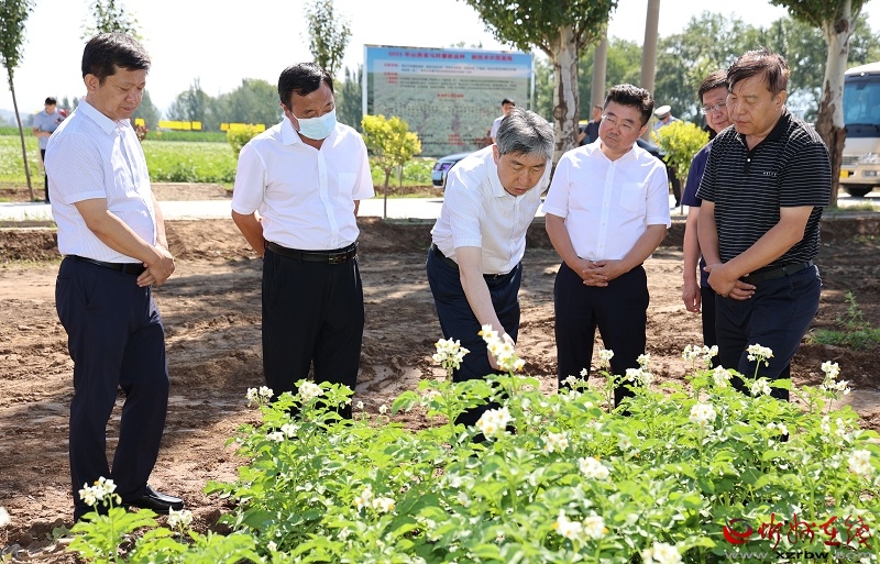 五寨是傳統(tǒng)農業(yè)大縣,馬鈴薯種植歷史悠久。如今在小胡會村的馬鈴薯新品種、新技術示范基地,綠油油的馬鈴薯,白色小花競相開放,抬頭遠眺,跨過大型移動噴灌設備,馬鈴薯苗一眼望不到邊?;赝ㄟ^馬鈴薯新品種、新技術的示范,篩選出品質優(yōu)、抗病性強、產量高、適宜本土種植的馬鈴薯新品種(系),推動馬鈴薯先進適用栽培新技術的推廣應用。朱曉東走進田壟,察看薯苗長勢,與農技專業(yè)人員交流,了解減化肥減農藥試驗情況,詢問菜用型馬鈴薯與加工型馬鈴薯的價值區(qū)別。他強調,要切實把五寨80里丁字平川耕地資源用足用好,深研細究新品種新技術,不僅要在馬鈴薯的塊莖上做文章,在莖、葉、花上都要深入研究,調動專業(yè)機構專業(yè)人員在馬鈴薯花入茶、提取香精等更多方面努力探索,切實放大規(guī)模產業(yè)的獨特優(yōu)勢。