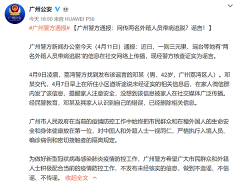 為做好新型冠狀病毒感染的肺炎疫情防控工作,廣州警方希望廣大市民群眾和外籍人士積極配合當(dāng)前的疫情防控工作,不發(fā)布未經(jīng)核實(shí)的信息,做到不造謠、不信謠、不傳謠。