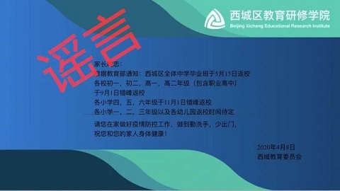 近日,“北京高三4月27日開(kāi)學(xué),六年級(jí)和初三5月11日開(kāi)學(xué)” 、“西城區(qū)全體中學(xué)畢業(yè)班5月15日返?!薄ⅰ氨本┠硡^(qū)教委接到通知,確認(rèn)9月1日前不會(huì)復(fù)學(xué)”等一系列消息在網(wǎng)上流傳。
