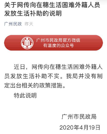 真相:廣州市民政局19日發(fā)表說明:近日,網(wǎng)傳向在穗生活困難外籍人員發(fā)放生活補(bǔ)助不實(shí)。我局并沒有制定出臺(tái)相關(guān)的政策措施。