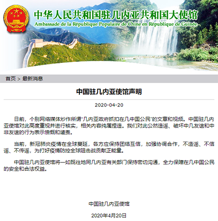 真相:4月20日,中國駐幾內(nèi)亞使館通過官方網(wǎng)站發(fā)布聲明表示,使館對(duì)此高度重視并進(jìn)行核實(shí),相關(guān)內(nèi)容純屬捏造。對(duì)此公然造謠、破壞中幾友誼和中非友誼的行為表示憤慨和譴責(zé)。