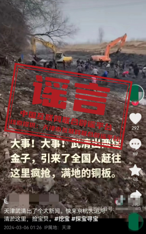 謠言:天津武清北運(yùn)河城區(qū)段清淤挖出寶?