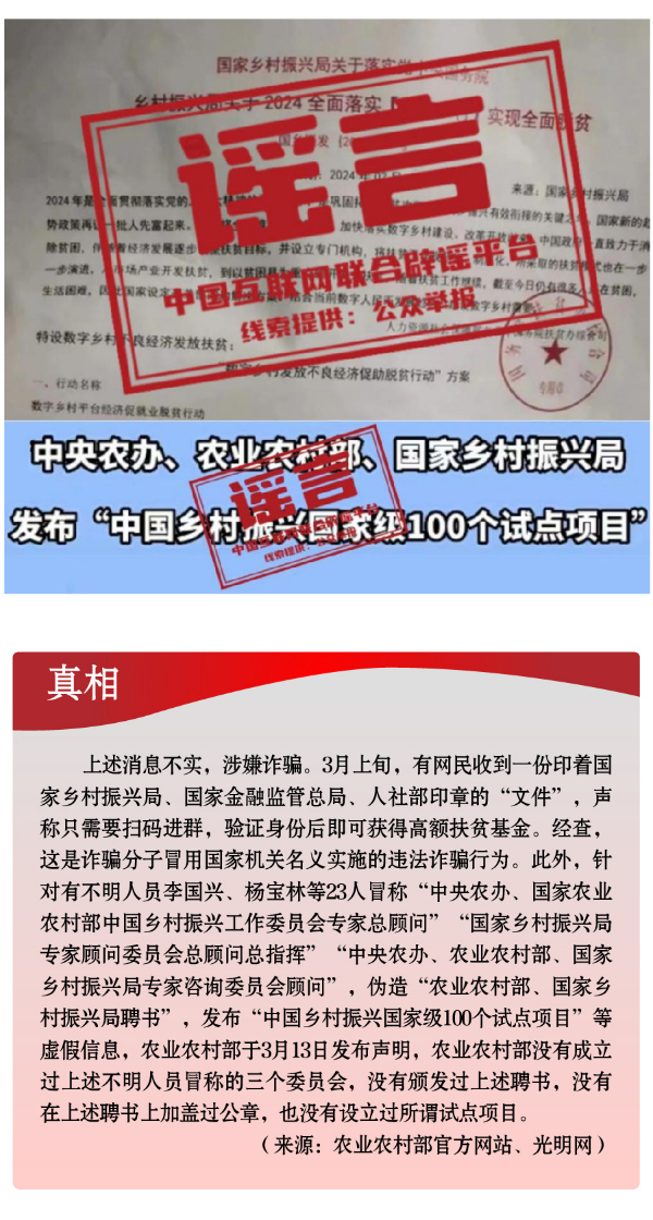 三類謠言誤導(dǎo)公眾 及時辨析以正視聽 ——中國互聯(lián)網(wǎng)聯(lián)合辟謠平臺2024年3月辟謠榜綜述 近日,中國互聯(lián)網(wǎng)聯(lián)合辟謠平臺對3月網(wǎng)絡(luò)謠言進行了梳理分析。網(wǎng)上數(shù)據(jù)監(jiān)測和網(wǎng)民舉報顯示,3月網(wǎng)絡(luò)謠言主要集中在公共政策類、社會民生類、安全事件類等方面,造謠傳謠者以假借權(quán)威、搭蹭熱點、制造恐慌等套路,虛構(gòu)事實,擾亂社會秩序,造成負面影響。 假冒權(quán)威杜撰政策類謠言,誤導(dǎo)公眾。3月以來,一些不法分子或機構(gòu)打著權(quán)威旗號,假冒國家機關(guān)、偽造政府公文、歪曲解讀政策,企圖行騙牟利。如,詐騙分子冒用國家機關(guān)名義,假稱“國家發(fā)放2024年鄉(xiāng)村振興扶貧補貼”“鄉(xiāng)村振興項目有國家級試點100個”“‘退稅綠色通道’加快退稅到賬速度”等,實施違法詐騙行為,給社會公眾造成極大信息和資金安全風(fēng)險。還有人制造、傳播“我國城鄉(xiāng)居民醫(yī)保參保人數(shù)近年來持續(xù)下降,部分地區(qū)農(nóng)村出現(xiàn)醫(yī)保退保潮”“失業(yè)保險金只能領(lǐng)一次,最多領(lǐng)24個月”“我國社?;鹑冀唤o外資機構(gòu)管理”等一系列與事實嚴(yán)重不符的涉公共謠言,迷惑性大、蠱惑性強,極易誤導(dǎo)公眾,對我國現(xiàn)有社保政策和相關(guān)工作造成負面影響。 搭蹭熱點散播民生類謠言,渲染焦慮。3月,全國兩會召開,“民生清單”熱度高?!按赫小薄按河巍钡葧r間節(jié)點,有關(guān)招工就業(yè)、疫病傳染等內(nèi)容也成為個別網(wǎng)民博眼球的素材。一些個人或自媒體歪曲甚或虛構(gòu)事實,編造散布社會民生謠言,引發(fā)公眾不必要的焦慮。如,別有用心者惡意虛構(gòu)事實,發(fā)布“重慶80%的工廠暫停招聘”“湖南郴州疫情卷土重來”等虛假信息,渲染負面情緒、徒增公眾憂慮、擾亂社會秩序;還有人為吸引流量、博取關(guān)注,根據(jù)主觀臆想,采取移花接木等手段,散播“京滬高速公路停止收費”“浙江麗水機場已建成投用并首航”“重慶合川太和飛機場正式開建”等涉重大基礎(chǔ)設(shè)施建設(shè)項目的假消息,誤導(dǎo)公眾認知,擾亂群眾交通出行秩序。 為博流量炮制安全類謠言,引發(fā)恐慌。春季歷來是森林火災(zāi)高發(fā)時段。加之開春后,工廠企業(yè)復(fù)產(chǎn)復(fù)工,致災(zāi)因素明顯增多。3月,全國多地發(fā)生火災(zāi)事故,一些網(wǎng)民為蹭熱點、博流量,趁機編織謠言,引發(fā)公眾恐慌。3月中旬,四川省甘孜州雅江縣發(fā)生森林火災(zāi),在當(dāng)?shù)貞?yīng)急、消防等部門組織救援人員全力撲救之際,卻有人編造“四川雅江山火救援力量正在撤出”“雅江仍有近千人被困火場”“雅江山火有三名撲火人員犧牲”等失實信息,嚴(yán)重干擾災(zāi)害應(yīng)急響應(yīng)和救援工作?!爸貞c南坪商業(yè)大樓火災(zāi)傷亡慘重”“湖南省長沙市天心區(qū)發(fā)生重大刑案,警方發(fā)布懸賞通告”“天津一銀行發(fā)生搶劫”等嚴(yán)重失實的涉公共安全類視頻流傳網(wǎng)絡(luò),或是造謠者自編自導(dǎo),或是利用AI技術(shù)偽造,卻引發(fā)群眾恐慌、造成惡劣影響。此外,“綠得發(fā)黑的菠菜不能吃”“清明蔗、毒過蛇”等食品安全類謠言,則是利用了時令和人們對食物中毒的擔(dān)憂情緒,夸大其詞、危言聳聽,目的都是販賣焦慮、制造恐慌,進而吸引眼球、騙取流量。 4月,隨著清明節(jié)假期到來,人們祭奠、祭祀、踏青等戶外活動增加,火災(zāi)、交通等各類安全事故隱患上升,既需謹防有關(guān)公共安全、民風(fēng)民俗、祭掃政策等方面的謠言閃現(xiàn),也需警惕借“代祭祀”“云祭奠”等實施的詐騙活動。此外,隨著氣溫回升,涉春季流行性疾病防治、健康養(yǎng)生等方面的謠言亦或容易滋生。 中國互聯(lián)網(wǎng)聯(lián)合辟謠平臺提醒廣大網(wǎng)民,網(wǎng)絡(luò)不是法外之地,請大家自覺規(guī)范網(wǎng)上言行,提高風(fēng)險防范意識,遠離謠言侵擾,共同營造清朗網(wǎng)絡(luò)空間,攜手走進人間四月天。 (責(zé)任編輯:蔡文斌) |