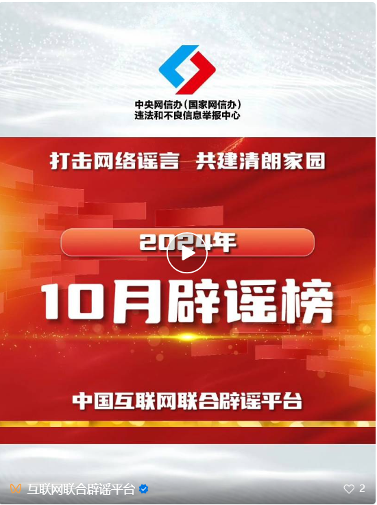 | 打擊網(wǎng)絡(luò)謠言 共建清朗家園 中國(guó)互聯(lián)網(wǎng)聯(lián)合辟謠平臺(tái)2024年10月辟謠榜 |