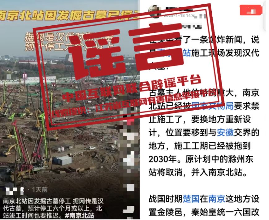 真相:近日,有網(wǎng)民在網(wǎng)絡(luò)平臺發(fā)帖稱,南京北站因挖到古墓,“已經(jīng)被國家文物局要求禁止施工了”“預(yù)計停工六個月或以上”“施工工期已經(jīng)被拖到2030年”等。經(jīng)江蘇省互聯(lián)網(wǎng)辟謠平臺與省文物部門和屬地核實,目前沒有收到國家文物局關(guān)于“南京北站禁止施工”的有關(guān)通知,南京北站除個別涉及考古發(fā)掘作業(yè)區(qū)域外,其他施工作業(yè)均按計劃正常有序推進(jìn),網(wǎng)傳信息系謠言。(來源:江蘇省互聯(lián)網(wǎng)辟謠平臺、“南京網(wǎng)絡(luò)辟謠”微信公眾號)