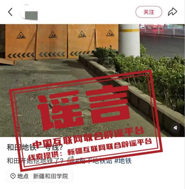 真相:近日,有網(wǎng)民發(fā)布消息稱“新疆和田要建地鐵一號線?開始挖地鐵了?”,并配以道路施工圖片,引發(fā)關(guān)注。經(jīng)和田市交通運(yùn)輸局核實(shí),網(wǎng)傳信息系謠言,截至目前,未收到任何關(guān)于和田市開挖地鐵的工作通知或確認(rèn)信息。(來源:“新疆網(wǎng)絡(luò)辟謠”微信公眾號)