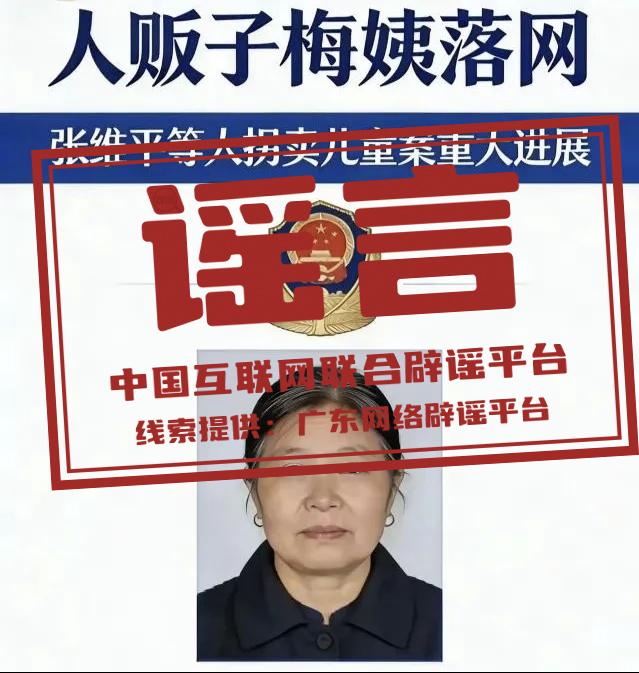 詳情:近日,廣州警方宣布“張維平拐賣兒童案”關(guān)鍵人物“梅姨”(謝某某)落網(wǎng)。不久后,一張標(biāo)有警徽、配著所謂落網(wǎng)“梅姨”照片的圖片在網(wǎng)絡(luò)流傳。經(jīng)核查,該網(wǎng)傳圖片并非警方發(fā)布,所謂的“梅姨”照片為虛假照片。