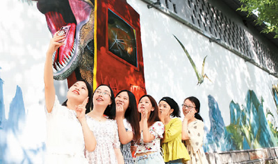 人們?cè)凇熬W(wǎng)紅打卡點(diǎn)”重慶永川恐龍3D藝術(shù)墻繪前留影。陳仕川攝 (人民圖片)