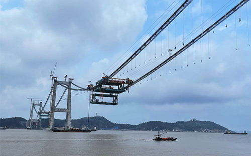 “大橋主梁最大節(jié)段重量達到813噸,國內(nèi)現(xiàn)有纜載吊機根本無法滿足單臺起吊需求?!迸藵蛴浾弑硎?,為解決這一難題,項目創(chuàng)新研制國內(nèi)首套1000噸級纜載吊機,搭載人機界面、傳感器技術(shù)、通訊技術(shù)等技術(shù),把安裝精度誤差控制在5毫米內(nèi),確保施工過程安全高效。