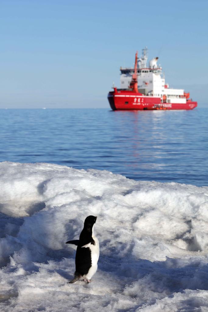小企鵝遙望“雪龍2”號(12月27日攝)