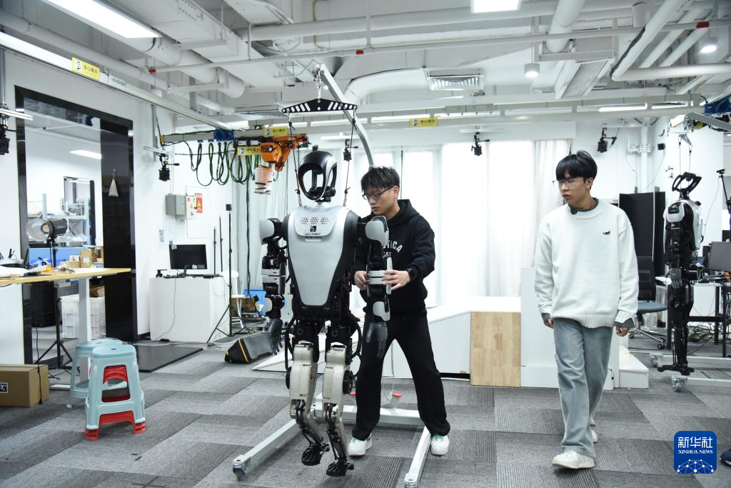樂聚(深圳)機(jī)器人技術(shù)有限公司的兩名工作人員正在調(diào)試一臺“夸父”人形機(jī)器人(1月21日攝)。新華社記者洪澤華攝