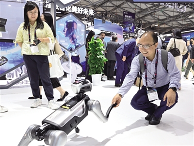 6月18日,觀眾在2025年世界移動(dòng)通信大會(huì)(上海)中國電信展臺(tái)與智能機(jī)器狗互動(dòng)。 記者 陳愛平 攝