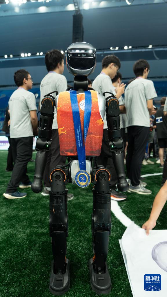 圖為清華火神隊(duì)使用的加速進(jìn)化T1機(jī)器人佩戴冠軍獎(jiǎng)牌。新華社發(fā)