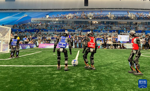 圖為2025世界人形機(jī)器人運(yùn)動(dòng)會(huì)上機(jī)器人在踢足球。新華社記者 魏夢佳 攝