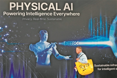從制造業(yè)到醫(yī)療,從交通到家庭服務(wù),物理AI正以前所未有的深度融入并賦能各行各業(yè)。圖為一名男子在2026年美國(guó)拉斯維加斯消費(fèi)電子展上走過(guò)印有物理AI字樣的展臺(tái)。新華社發(fā)(曾慧攝)