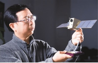 中科院院士潘建偉在辦公室內與“墨子號”量子衛(wèi)星模型合影。(新華社記者 張端 攝)