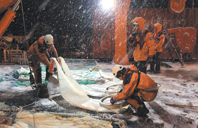 科考隊員們在“雪龍2”號的艉甲板進行海洋調(diào)查準備工作。陳亮宇 攝
