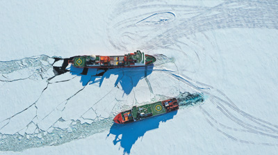 “這次陸緣冰接近2米的厚度,遠遠超出了‘雪龍’號破冰能力,也超過了‘雪龍2’號設計的1.5米破冰水平?!薄把?”號船長肖志民告訴記者,面對挑戰(zhàn),科考隊精心準備,利用直升機和無人機開展多次探冰勘察,制定破冰方案。通過艏艉向連續(xù)破冰、艏向沖撞破冰的方式,“雪龍2”號僅用2天時間,就開辟出長度約16.5海里的陸緣冰區(qū)航道,最終抵達預定卸貨點,并將“雪龍”號引航至卸貨點。