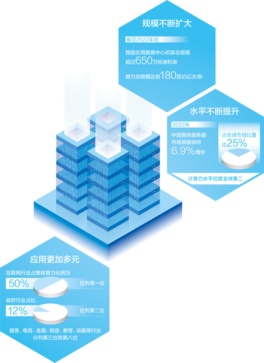《2022—2023全球計(jì)算力指數(shù)評估報(bào)告》顯示,2022年,中國整體服務(wù)器市場規(guī)模保持6.9%的正增長,占全球市場比重達(dá)25%,計(jì)算力水平位居全球第二。近年來,我國算力產(chǎn)業(yè)蓬勃發(fā)展,融合應(yīng)用深度不斷拓展。算力作為數(shù)字經(jīng)濟(jì)時代的關(guān)鍵生產(chǎn)力,有效賦能千行百業(yè)數(shù)字化轉(zhuǎn)型,推動新興產(chǎn)業(yè)發(fā)展。