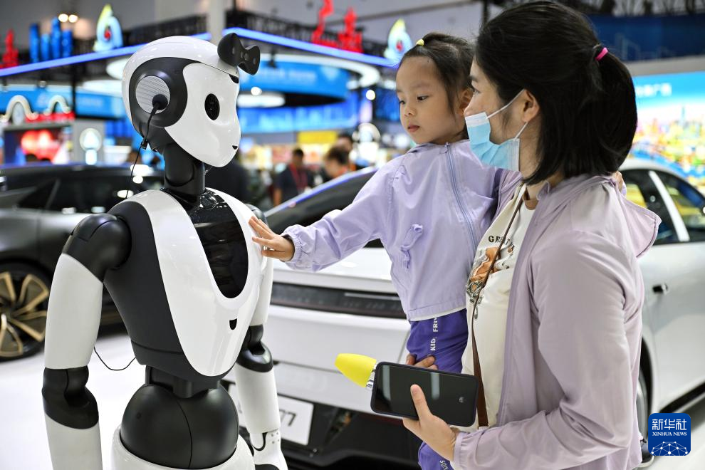 4月15日,觀眾在消博會上與AI人形智能服務機器人互動。新華社記者 郭程 攝