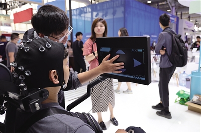 圖為2024服貿會上,工作人員在為參觀者講解使用非侵入式腦機接口技術的腦控神經康復訓練機器人。記者 戚曉毅 攝