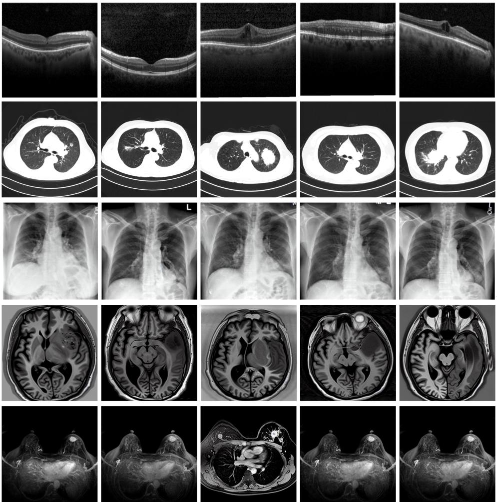 實驗結(jié)果顯示,MINIM生成的合成數(shù)據(jù)在醫(yī)生主觀評測指標和多項客觀檢驗標準方面達國際領(lǐng)先水平,在臨床應用中具有重要參考價值。在真實數(shù)據(jù)基礎(chǔ)上,使用20倍合成數(shù)據(jù)在眼科、胸科、腦科和乳腺科的多個醫(yī)學任務準確率平均可提升12%至17%。