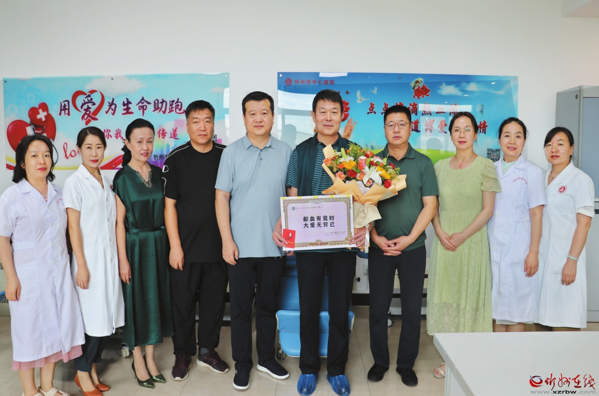 梁占海先生是我市繁峙籍人士,原計(jì)劃在7月18日,60周歲生日當(dāng)天完成最后一次獻(xiàn)血。連日暑浪滾滾,7月13日下午他瞅準(zhǔn)雨后氣溫下降的空隙,駕車125公里來到市中心血站,捐獻(xiàn)2治療量的血小板,在六十周歲生日,完成最后一獻(xiàn)“光榮退役”。血站郭建卿站長率班子成員到現(xiàn)場慰問,對他發(fā)揚(yáng)人道主義精神,弘揚(yáng)助人為樂品德的行動表示贊揚(yáng),對他為我市無償獻(xiàn)血事業(yè)做出的貢獻(xiàn)表示感謝。獻(xiàn)血結(jié)束后,中心血站的領(lǐng)導(dǎo)護(hù)士同梁占海先生合影留念,祝賀他花甲生日吉祥、身體健康。