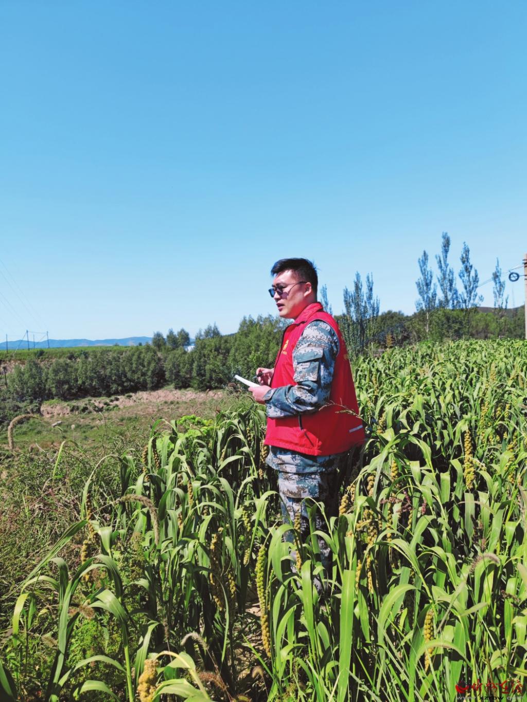 郭晉超在田間記錄莊稼長勢情況