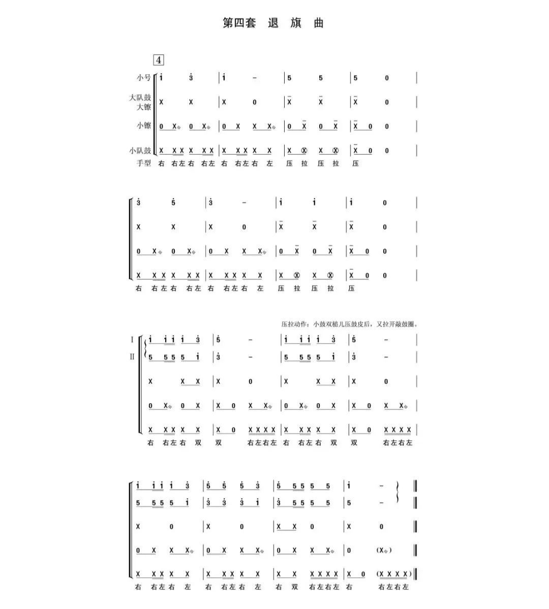 少先隊鼓號隊總譜除間奏鼓外共10套曲目,包括:開場曲、進行曲、出旗曲、退旗曲、頒獎曲、授巾曲、檢閱曲、宣誓曲、迎賓曲、歡送曲。