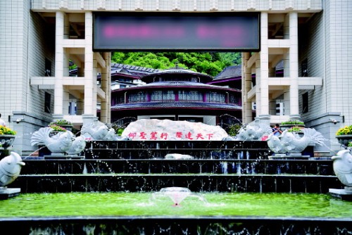 校園內(nèi),除隨處可見的石砌欄桿外,每棟建筑均有仿唐式建筑屋頂。西南角一處長約50米、落差15米左右的多級瀑布群上建有涼亭,四周有假山、水車、棧道、水景、石拱橋等。