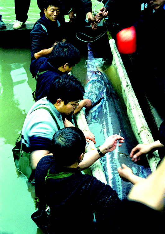 ▲2003年1月27日,在四川宜賓主城區(qū)附近的長江岸邊,專家正在對(duì)一只白鱘進(jìn)行救治,這只白鱘是一位漁民在涪溪口發(fā)現(xiàn)的。