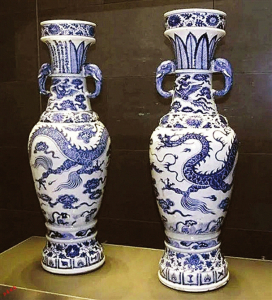 大維德花瓶可能是現(xiàn)存最重要的青花瓷器物,其頂部附近的銘文表明它們的年代可以追溯到1351年。1935年,珀西瓦爾·大維德爵士分別從兩個(gè)收藏家手中買(mǎi)下它們,令這對(duì)花瓶重聚。