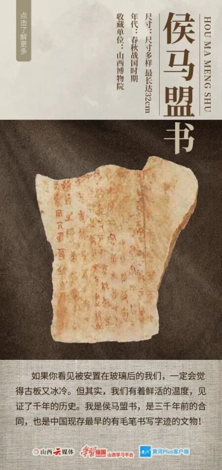 中國最早的毛筆字文物侯馬盟書 將要參加書法特展 盤發(fā)神器鼻祖笄 走紅網(wǎng)絡 …… 連日來 山西的“寶貝”頻頻走進大眾視野 或許大家還不知道 來自山西文物界的“中國最早” 可不止這些 我們一起來了解一下吧 什么什么?看不懂它是什么? 這可是中國最早的毛筆字!