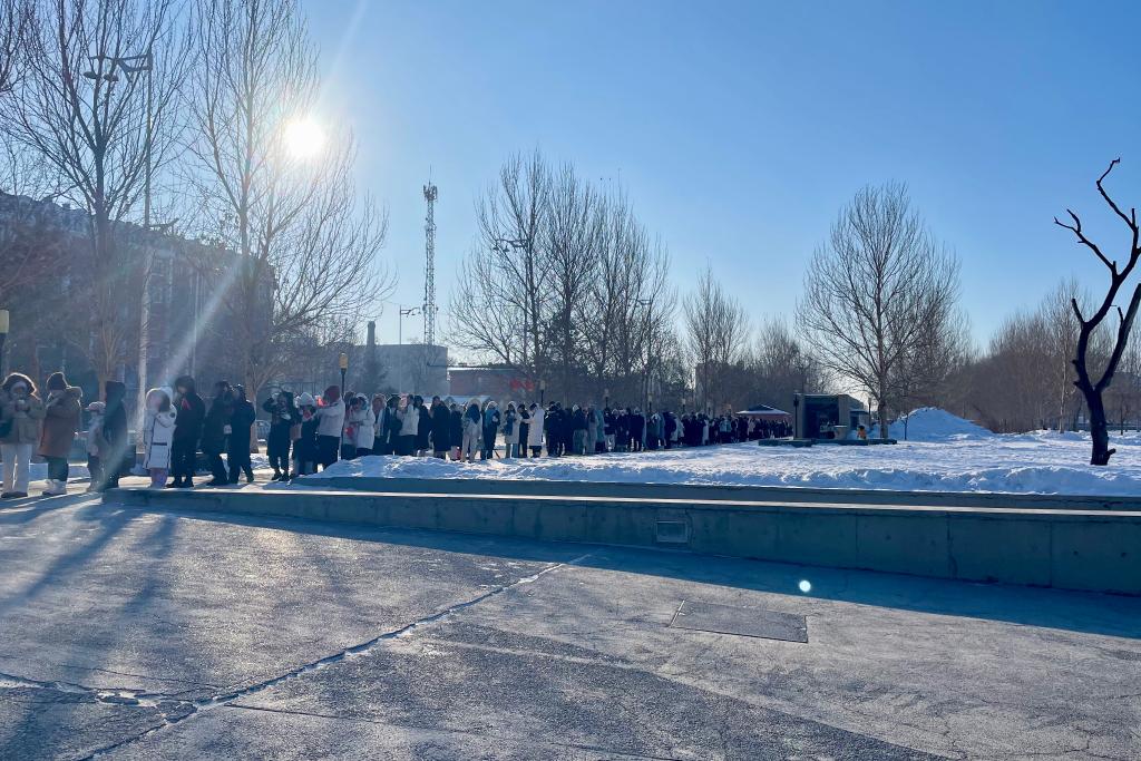 9日早上,哈爾濱氣溫低至零下20攝氏度,陳列館外早已排起長隊。為了迎接高峰,陳列館延長開放時間,游客通過網(wǎng)上預(yù)約可免費(fèi)入館參觀,還有志愿者送上熱水或玉米糊幫他們驅(qū)寒。