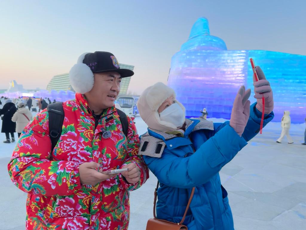 1月9日,在哈爾濱冰雪大世界,騰越(左)與游客合影。新華社記者 楊思琪 攝