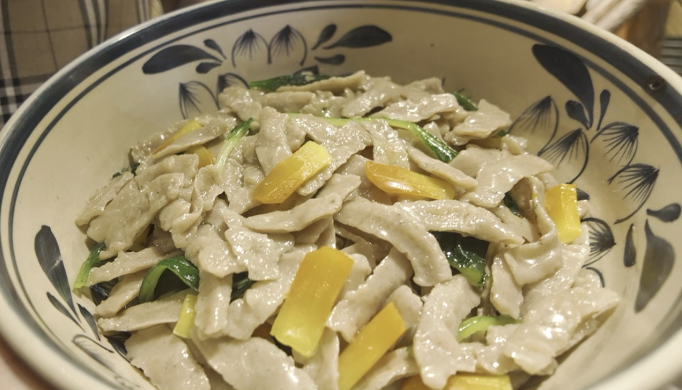 當(dāng)然,最好用的工具當(dāng)屬做面的“魔法棒”——手指。用手指將莜面的小面團(tuán)搓成橄欖形,上鍋一蒸,就成了“莜面魚(yú)魚(yú)”;將面團(tuán)放在砧板上,用手掌后部往前推壓成薄片,就成了“栲栳栳”;將面團(tuán)分切成小面丁以后,用大拇指一抿,就成了“貓耳朵”;將小麥面加一兩種雜糧面混勻后和成較軟的面團(tuán),勻速將面擠壓出手指縫,就成了“握流流”。在“魔法棒”的作用下,面團(tuán)變成了各式各樣的美餐,給山西人帶來(lái)了無(wú)盡舌尖上的享受。