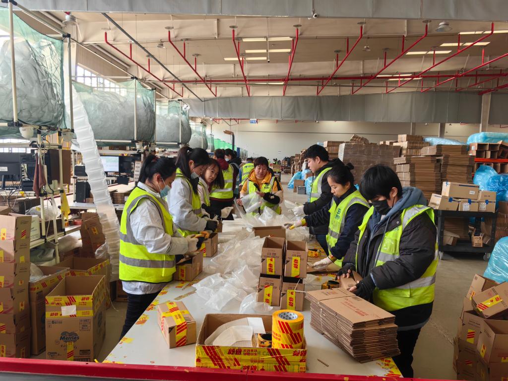 1月22日,在位于山東煙臺的日韓消費品跨境電商中心京東綜合倉內(nèi),工作人員將貨物分揀、打包。新華社記者 邵琨 攝
