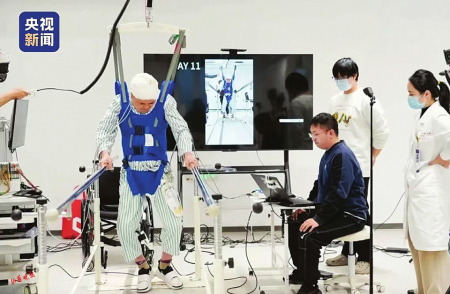 術(shù)后12天,林先生正在聯(lián)合團隊指導(dǎo)下開展康復(fù)訓(xùn)練。術(shù)后第1天林先生的右腿就出現(xiàn)了緩慢的屈曲,第3天實現(xiàn)自主腦控狀態(tài)下的雙下肢運動,第10天實現(xiàn)自主控制雙側(cè)下肢跨步行走,第49天