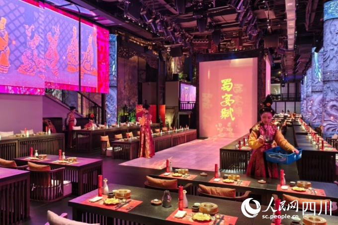 東郊記憶園區(qū)內(nèi)以蜀地文化為創(chuàng)作背景,溯源中國(guó)傳統(tǒng)宴飲儀禮打造的全景沉浸式漢文化主題餐秀——蜀宴賦。人民網(wǎng) 趙祖樂(lè)攝
