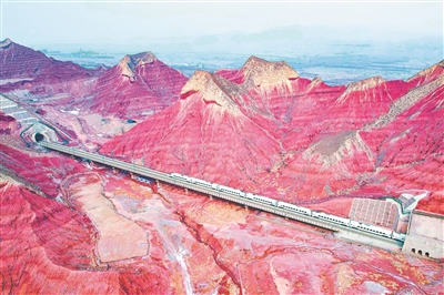 圖為1月18日,一列動車組列車行駛在蘭州市境內(nèi)的丹霞地貌群中。