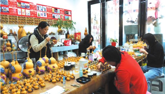 在工作室內,手工藝人侯晉麗正專注地為葫蘆彩繪。她介紹說:“我們制作的每一件葫蘆雕刻作品都需要多重工序,從篩選葫蘆到刮皮、晾曬、浸泡、拋光,再到依形構思、打稿設計,最后經過線刻、浮雕等精雕細琢與上色收尾,每一個工序都考驗著我們的耐心與功力。”