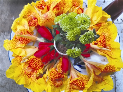 他用鮮花點綴菜攤