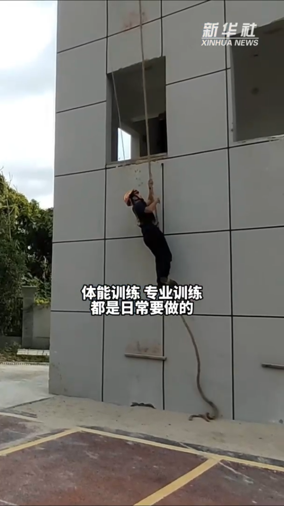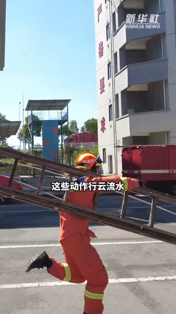 整理內(nèi)務(wù)、體能訓(xùn)練、專業(yè)訓(xùn)練都是日常要做的,穿著40多斤重的裝備,身手十分的嫻熟。拋擲水帶、連接分水器、架設(shè)消防梯、水槍連接水帶這些動(dòng)作行云流水,絲毫不拖沓。