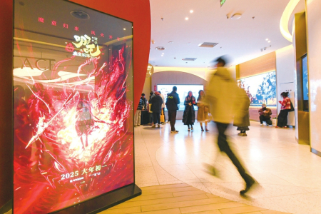 2月9日,在成都一家影院,觀眾經(jīng)過《哪吒之魔童鬧?!罚ā赌倪?》)的電子海報。