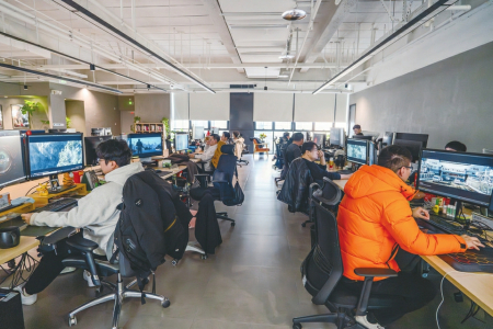 2月10日拍攝的《哪吒之魔童鬧?!罚ā赌倪?》)視覺特效制作公司墨境天合成都數(shù)字圖像科技有限公司的工作區(qū)。
