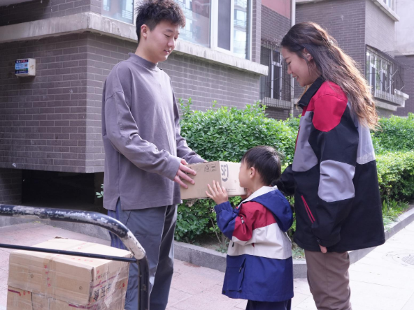 母子倆戴上頭盔,奔赴第一個派送點。到達(dá)小區(qū)后,面對要送2件、取1件的任務(wù),辰辰興奮地自告奮勇抱起快遞跑進(jìn)樓道,卻很快被現(xiàn)實“上了一課”——沒有電梯,收件人住在5層。當(dāng)他送完這家,額頭滿是汗水,步伐也明顯跟不上媽媽了。出了小區(qū),辰辰一句“真累呀,還有那么多,得送到啥時候啊”,道出了孩子對媽媽工作艱辛的初步體會。而閆詩琪輕撫兒子頭說道,“孩子,干啥工作也要有耐心?!辈粌H是對兒子的鼓勵,更是她日常工作的真實寫照。