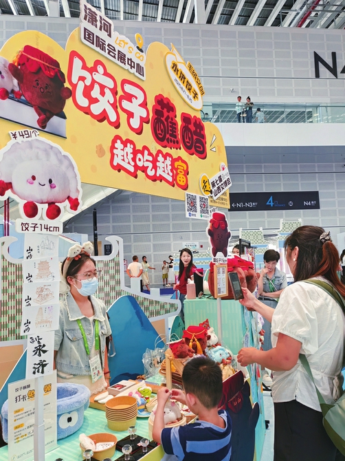胖乎乎的餃子、圓墩墩的醋缸,摸一摸,毛絨絨的,手感柔順細(xì)滑。8月24日,第七屆山西文博會現(xiàn)場,位于山西瀟河國際會展中心N4館的文創(chuàng)山西展區(qū),永濟(jì)市晉韻原創(chuàng)文創(chuàng)工作室獨特而醒目的門頭——“餃子蘸醋 越吃越富”,吸引了眾多參觀者的目光。該工作室展出的餃子蘸醋系列毛絨文創(chuàng)產(chǎn)品,也受到參觀者的關(guān)注和喜愛。