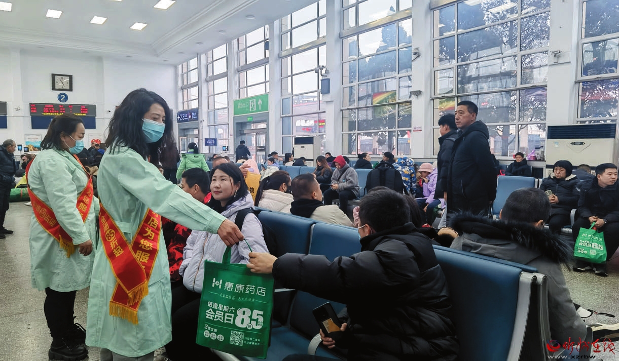 近日,國(guó)內(nèi)知名藥企廣州白云山和記黃埔中藥有限公司攜手我市當(dāng)?shù)厮幤箝_(kāi)展春運(yùn)愛(ài)心公益活動(dòng)。圖為工作人員在忻州火車站向候車乘客發(fā)放防流感藥品、口罩等健康禮包。(李建中攝)