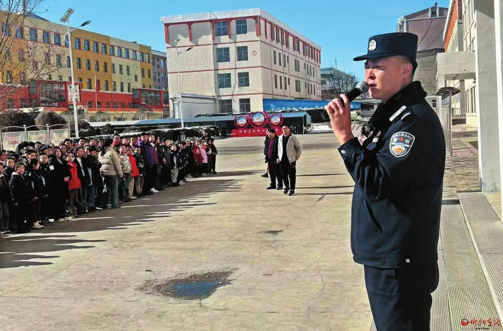 為進一步提升鐵路沿線學(xué)生的安全意識,近日,五寨火車站派出所深入管內(nèi)鐵路沿線五華里范圍內(nèi)學(xué)校開展法治安全宣傳教育,講解鐵路行車安全知識,增強學(xué)生的自我防護能力。圖為民警在五寨縣第四小學(xué)開展安全教育宣傳。(索效光攝)