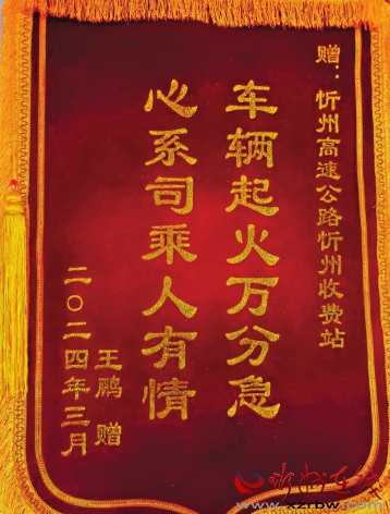 “嘀嘀,嘀嘀……”3月26日上午,一輛小型越野車行駛到忻州高速收費(fèi)站出口時(shí)突然起火,滾滾黑煙迅速彌漫開來,情況十分危急。面對突如其來的險(xiǎn)情,收費(fèi)員賈金花臨危不亂,迅速拿起滅火器沖向火源。由于處置及時(shí),火勢得到控制并最終被撲滅,車輛險(xiǎn)情成功排除。事后為了表達(dá)感謝之情,司機(jī)特意給忻州高速收費(fèi)站送去一面錦旗。